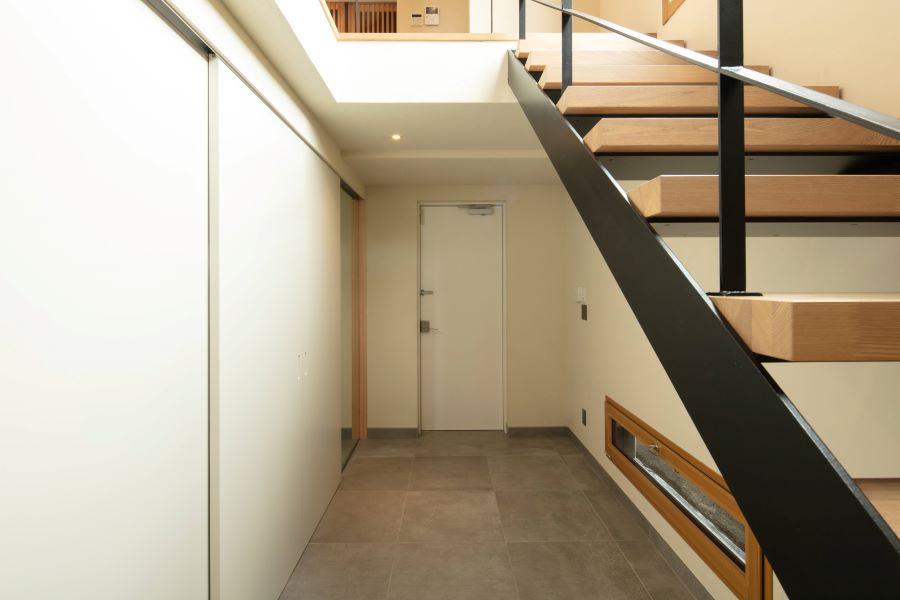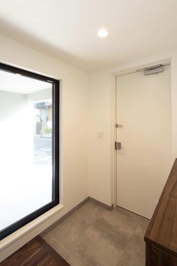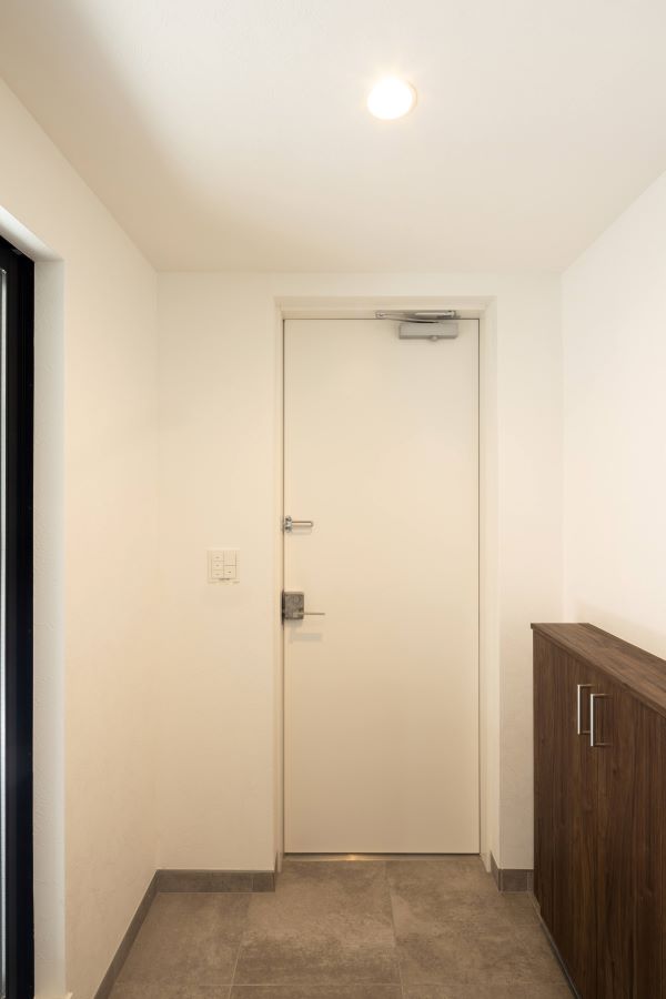 扉が枠から持ち出しているため、地震による家の歪みでドアが開けられないなど起きづらい免震構造。