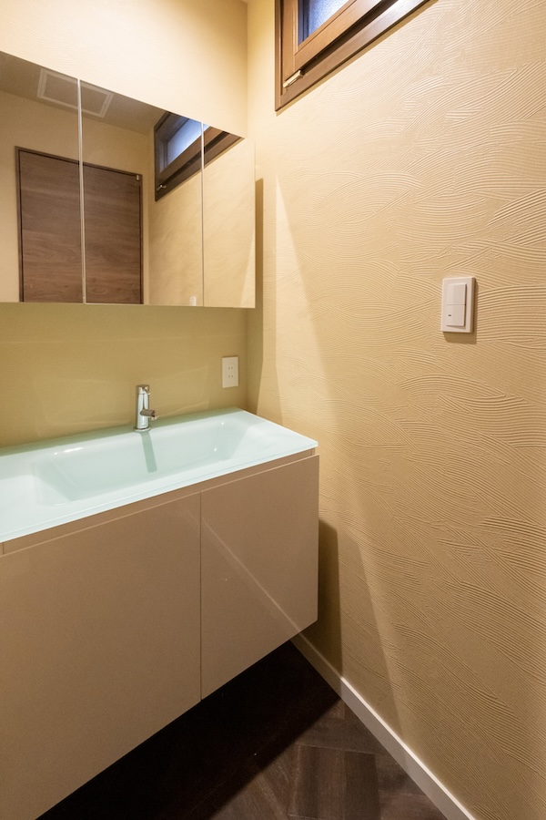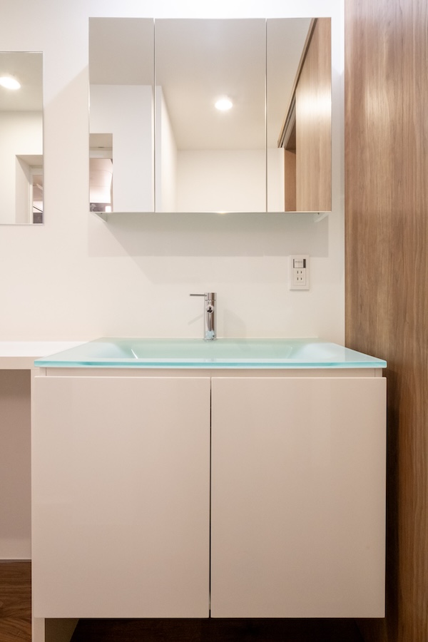 ガラスに熱を加え、ボウルを一体成型したシームレスなトップカウンター。本体とミラーキャビネットは白ウレタン塗装仕上げ。クリアガラスが清潔感あふれるサニタリースペースを演出します。※オーバフローはついておりません。水溜不可。