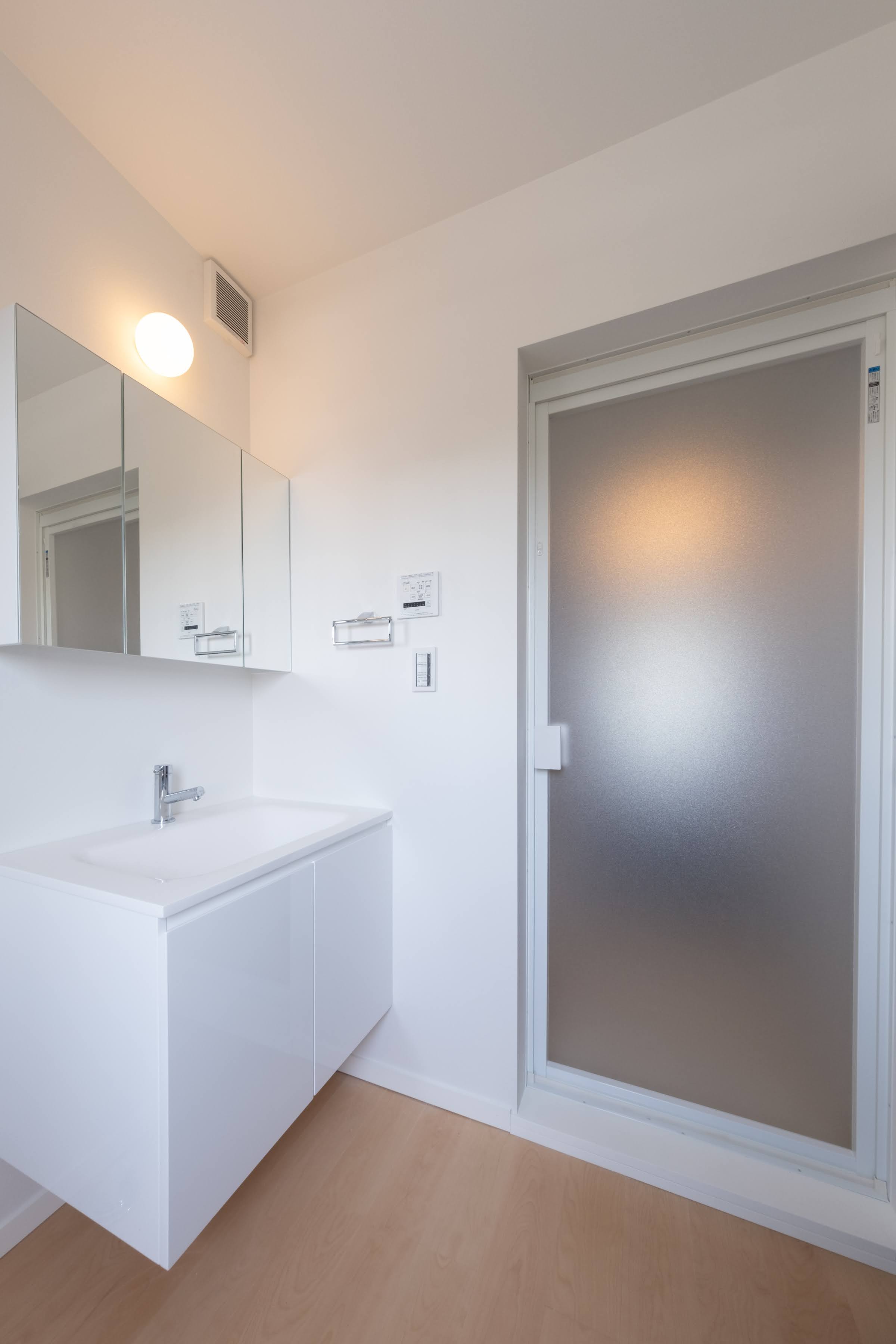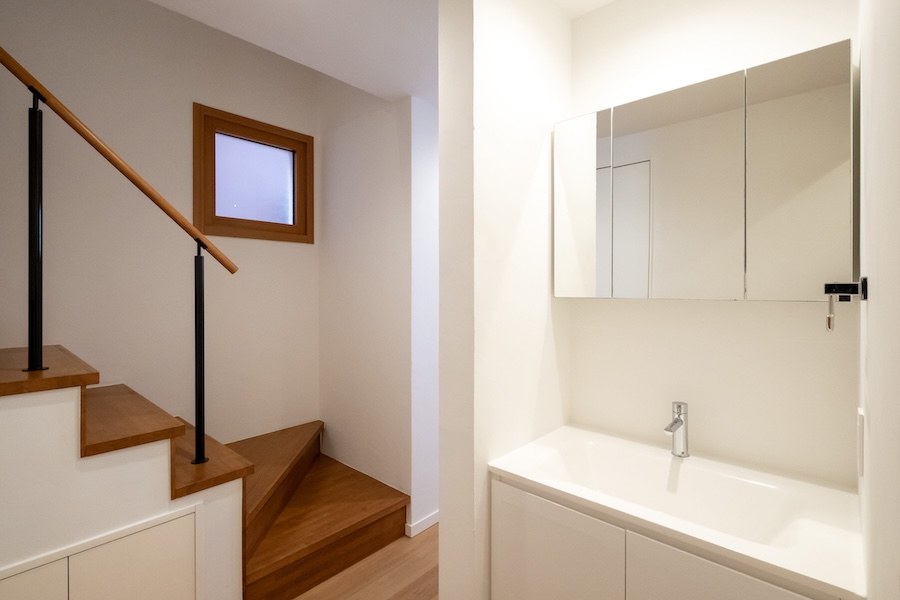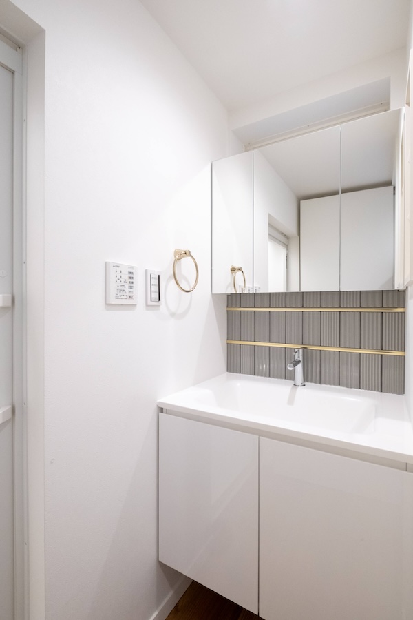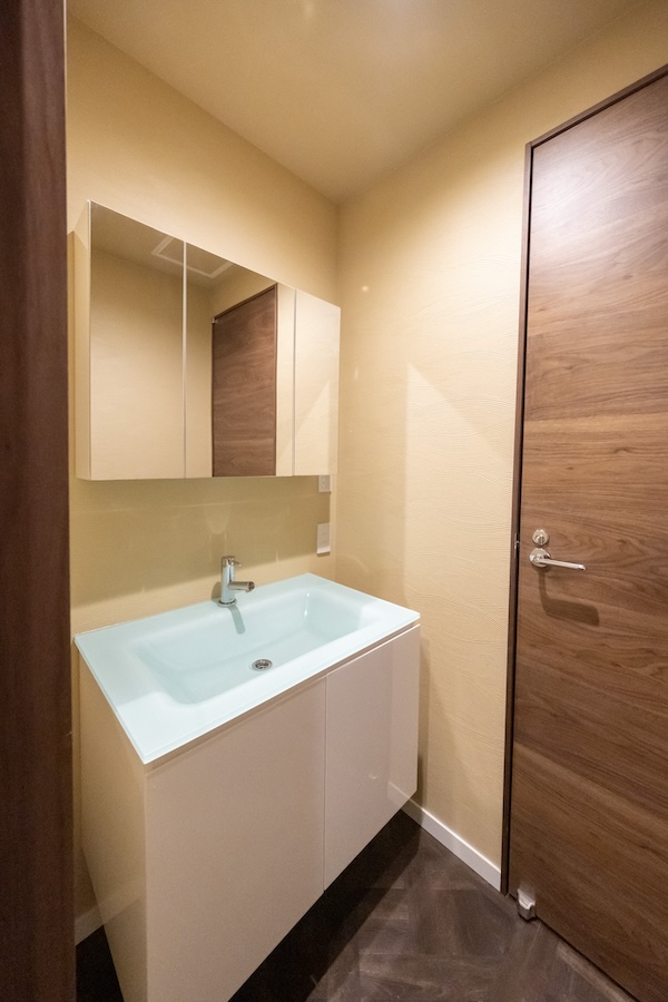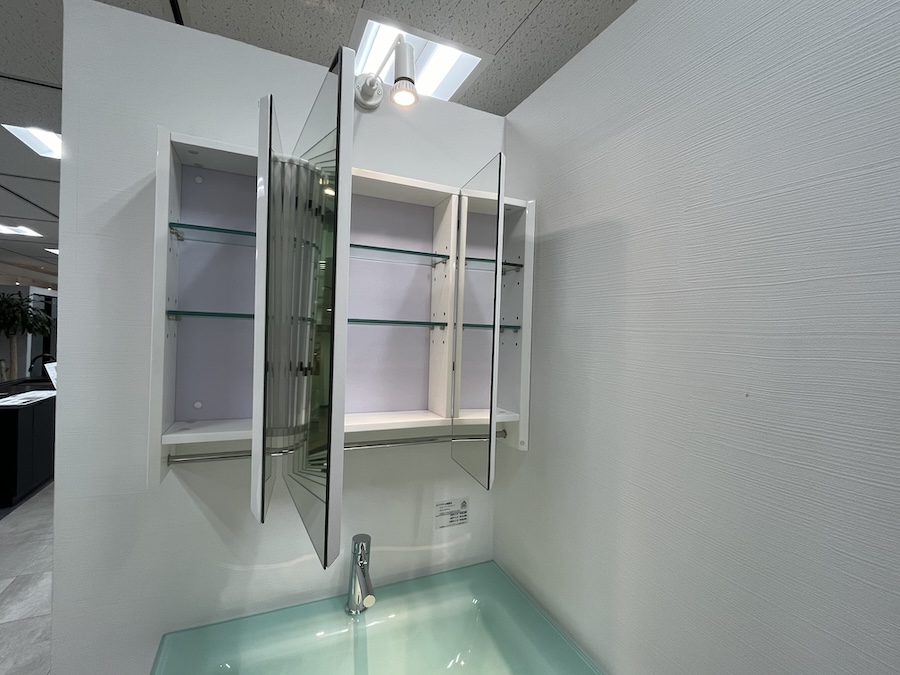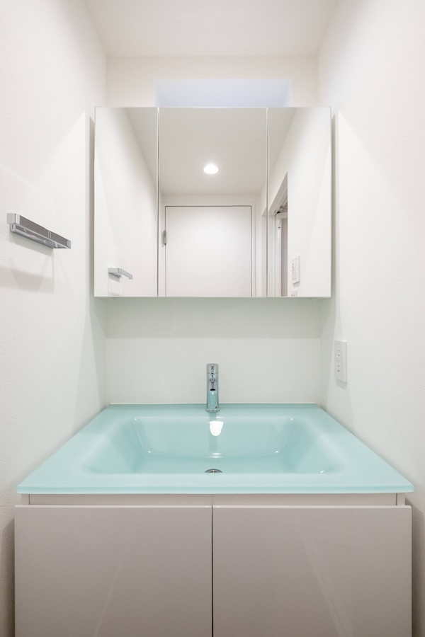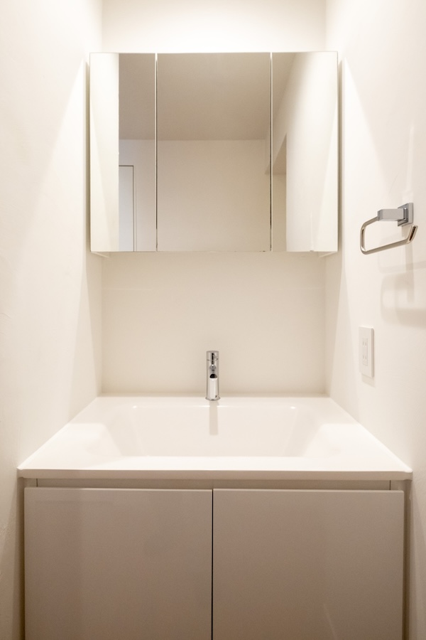 鏡と収納を一体化したミラーキャビネット。タオル掛けも一体となり美しさと機能面を両立しています。