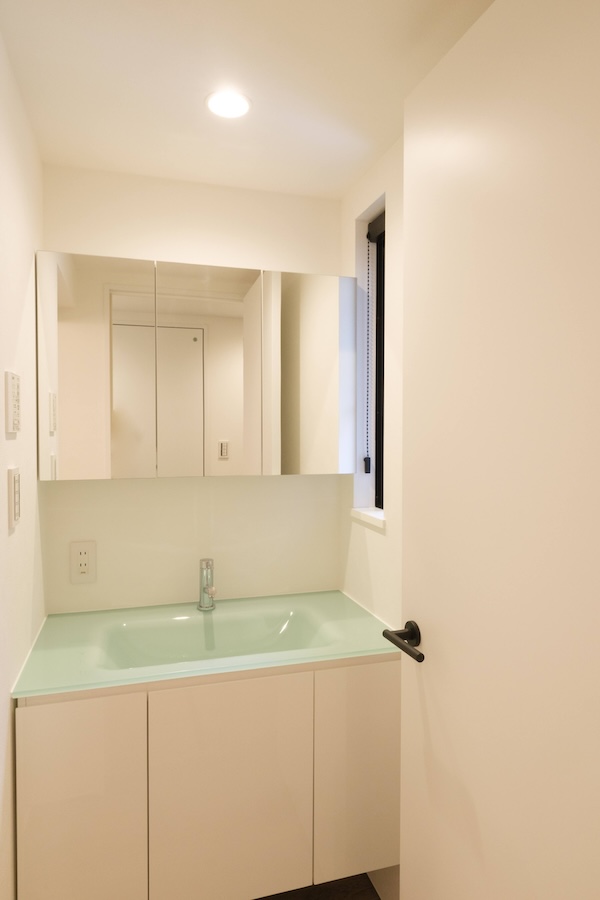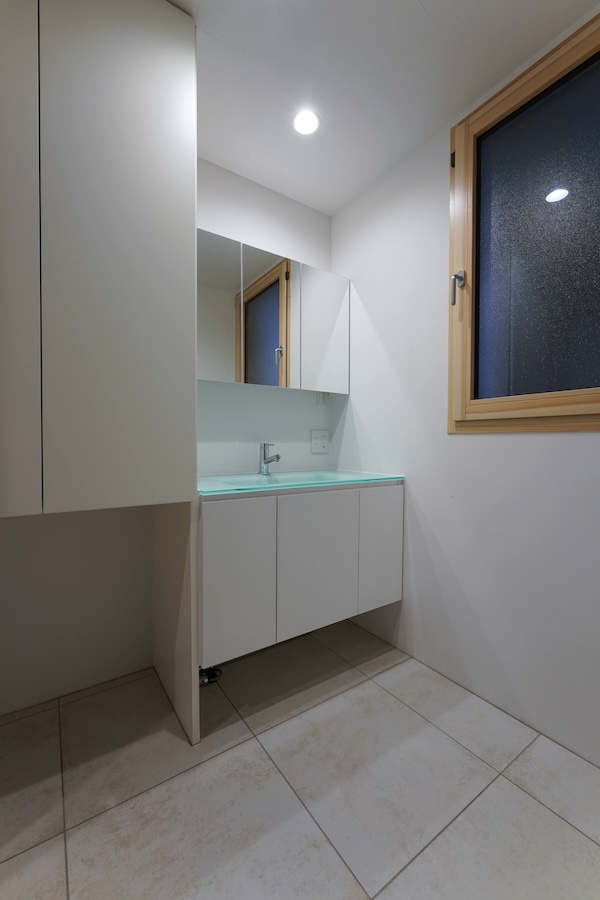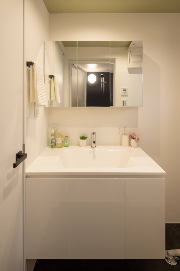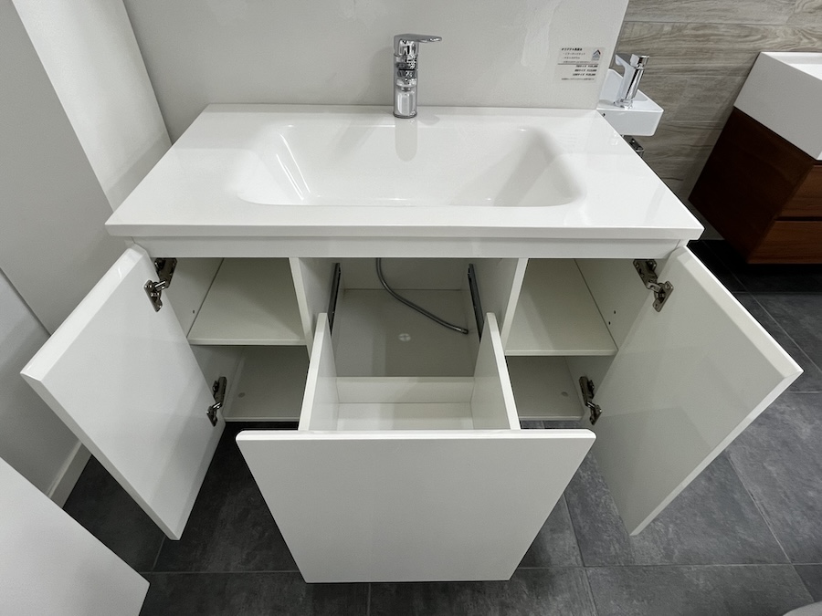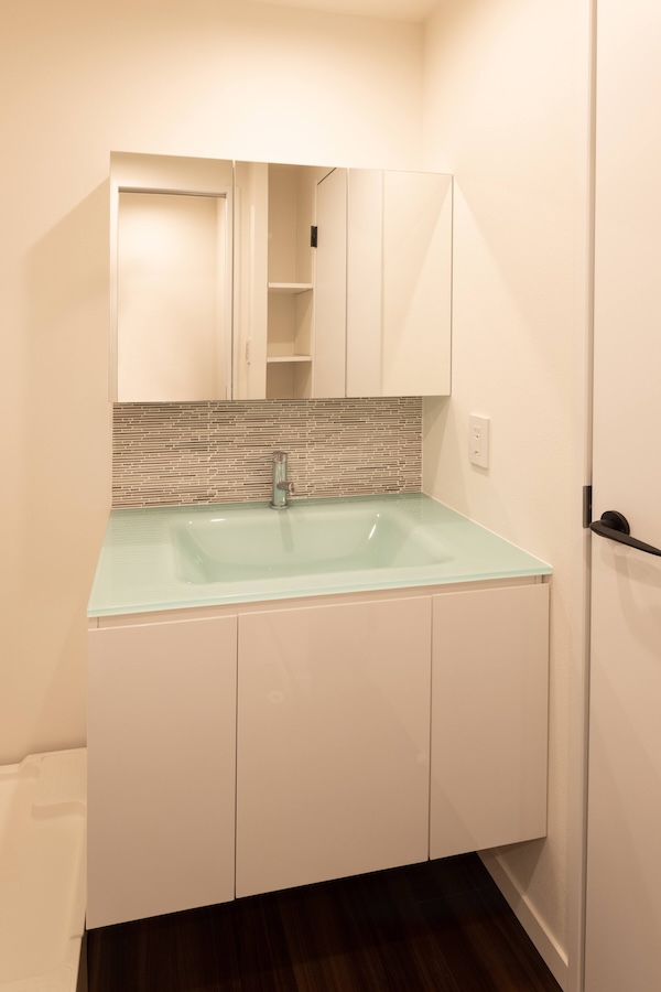 ガラスボウルに合わせた白さの美しいキャビネット。十分な収納スペースを確保できます。
