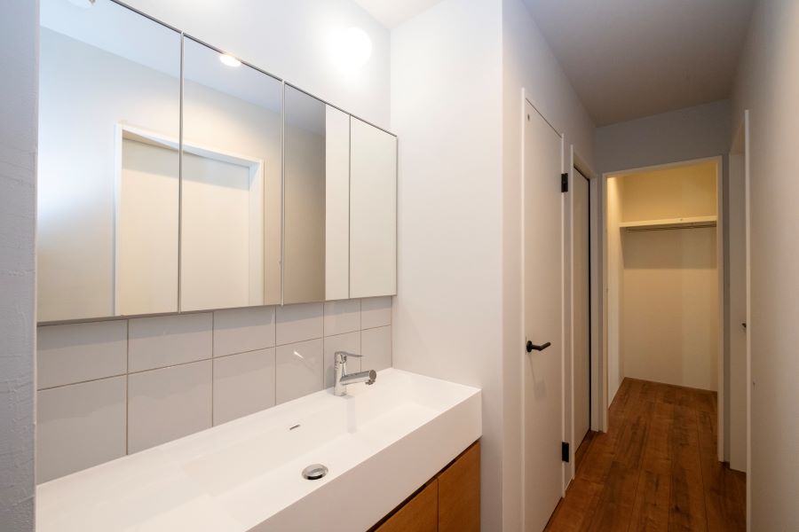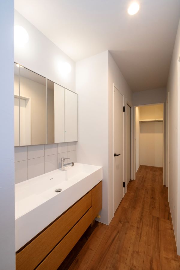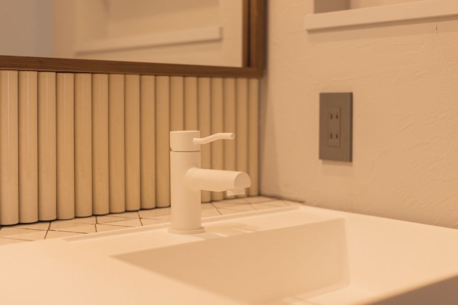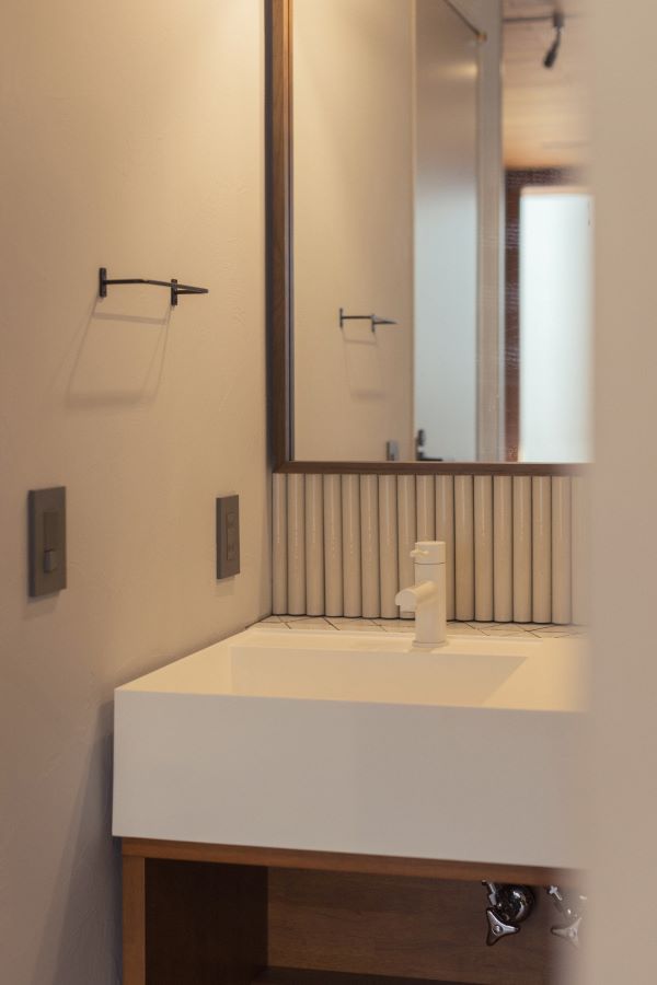 φ35ホールソウで穴あけ、水栓位置は現場で調整可能です。水栓を2台使えばツーボールように使うこともできます。人造大理石の無垢の洗面ボウル、マット仕上げです。