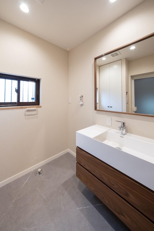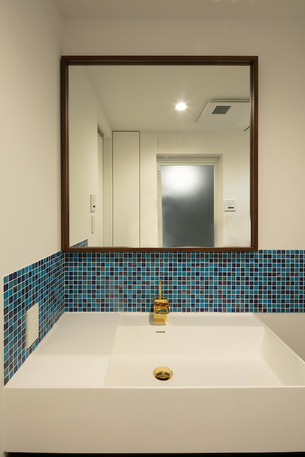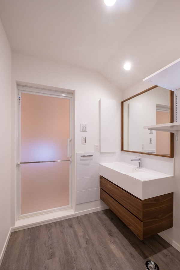 洗面台をよりシンプルに見せるために鏡面をオークで縁取りしました。