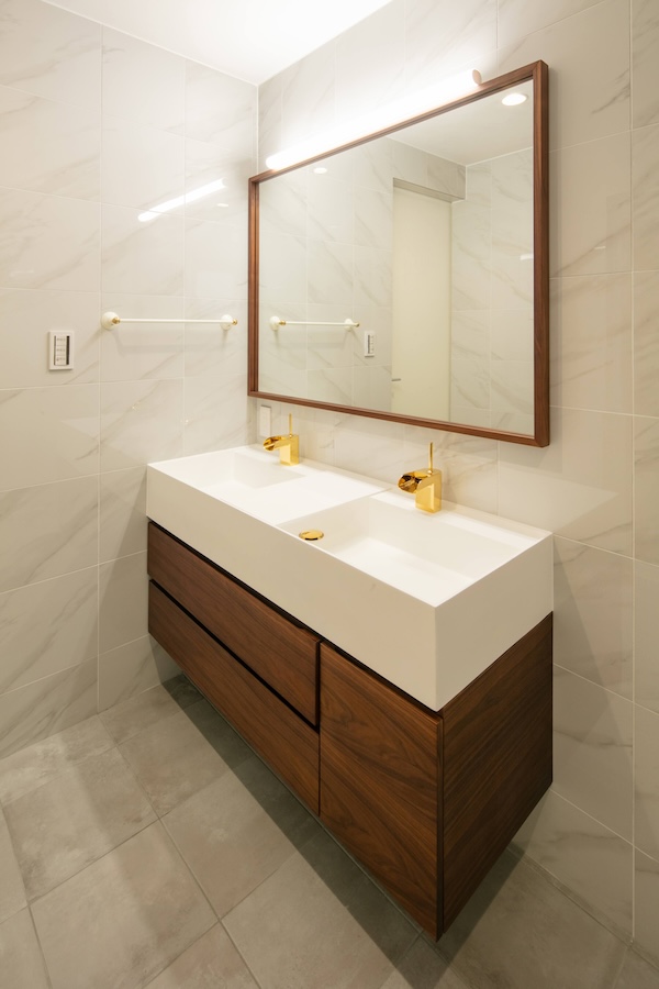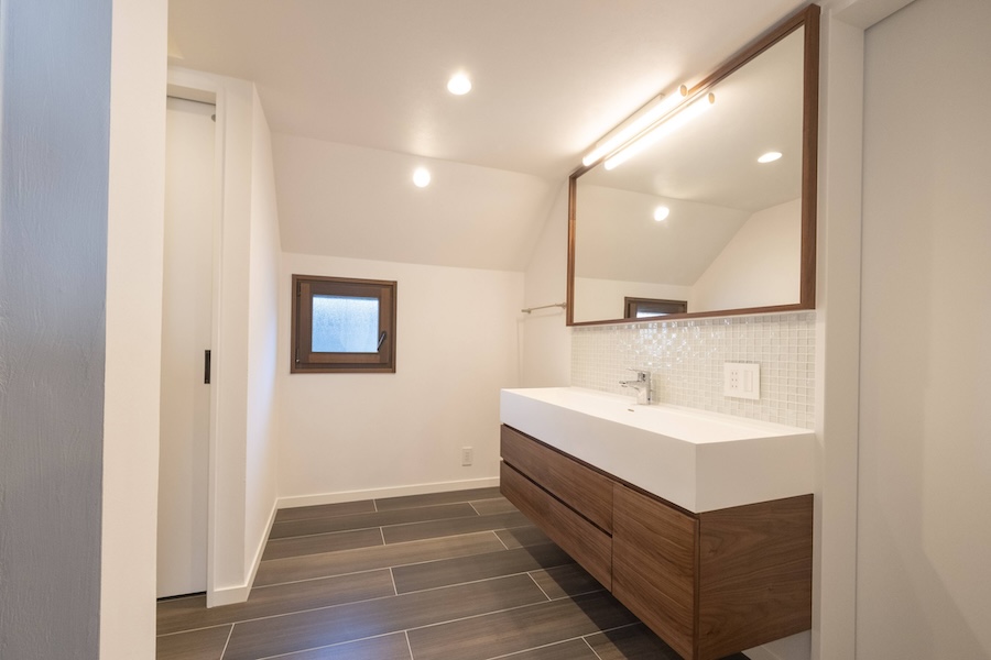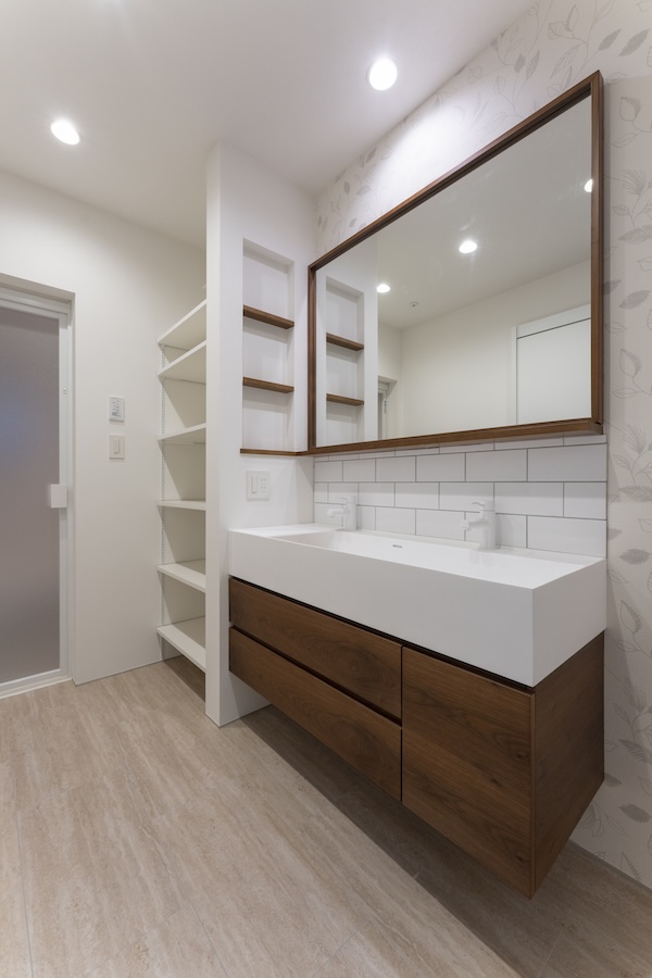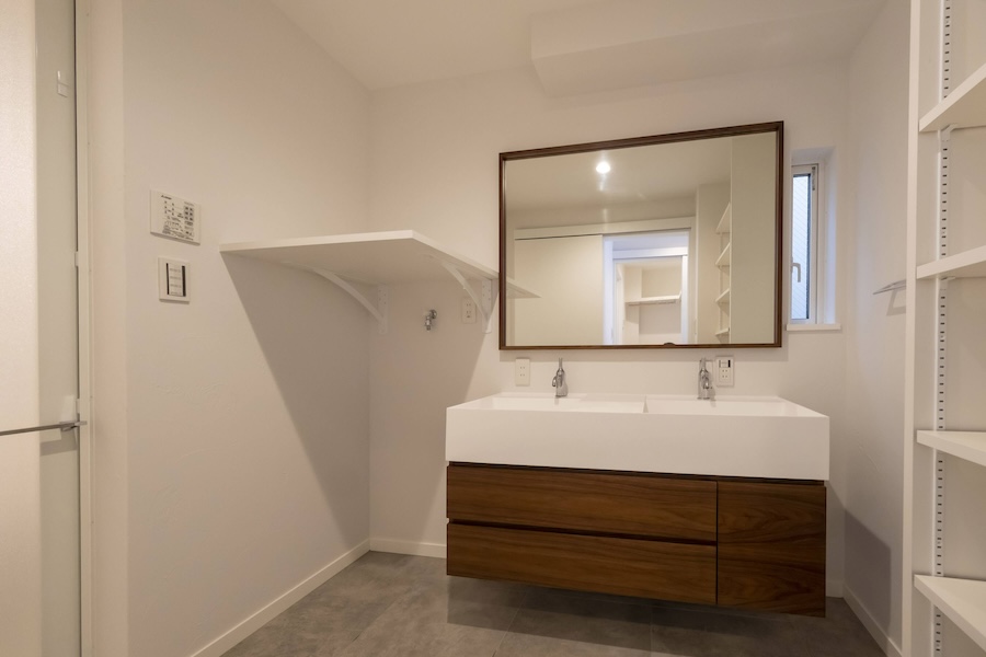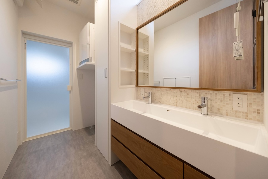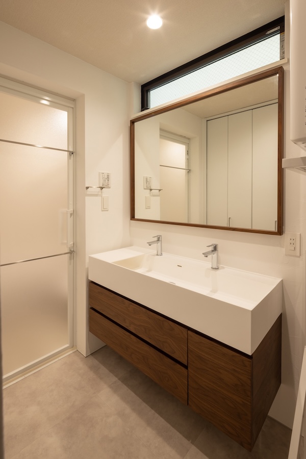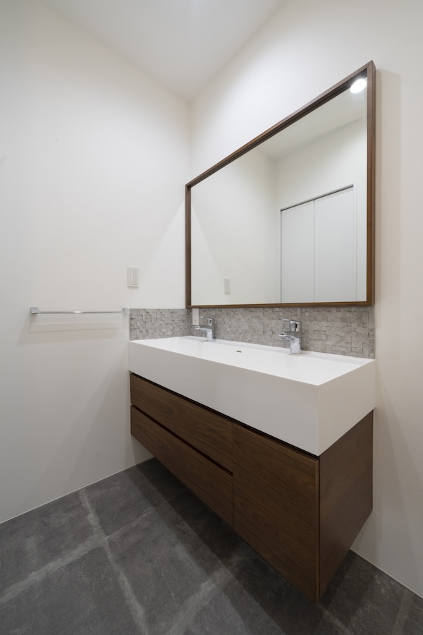 洗面台をよりシンプルに見せるために鏡面をオークで縁取りしました。