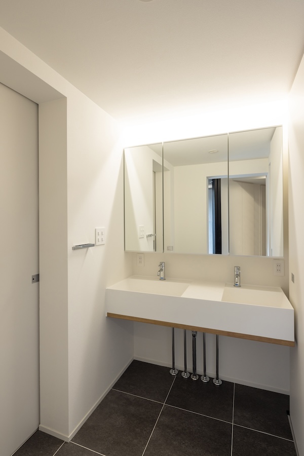 φ35ホールソウで穴あけ、水栓位置は現場で調整可能です。人造大理石の無垢の洗面ボウル、マット仕上げです。