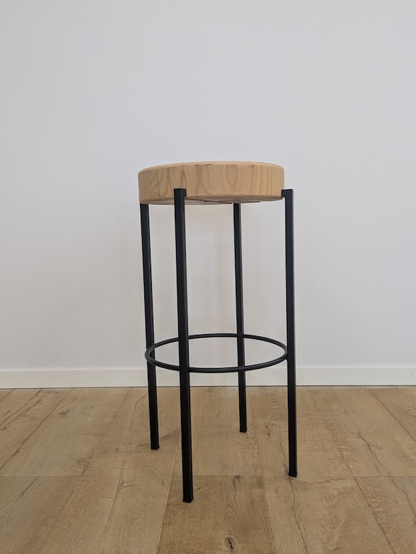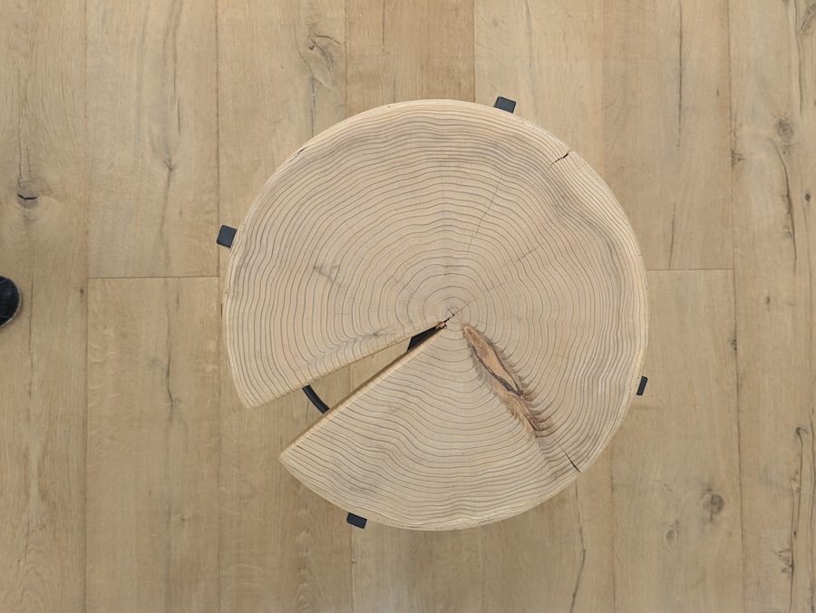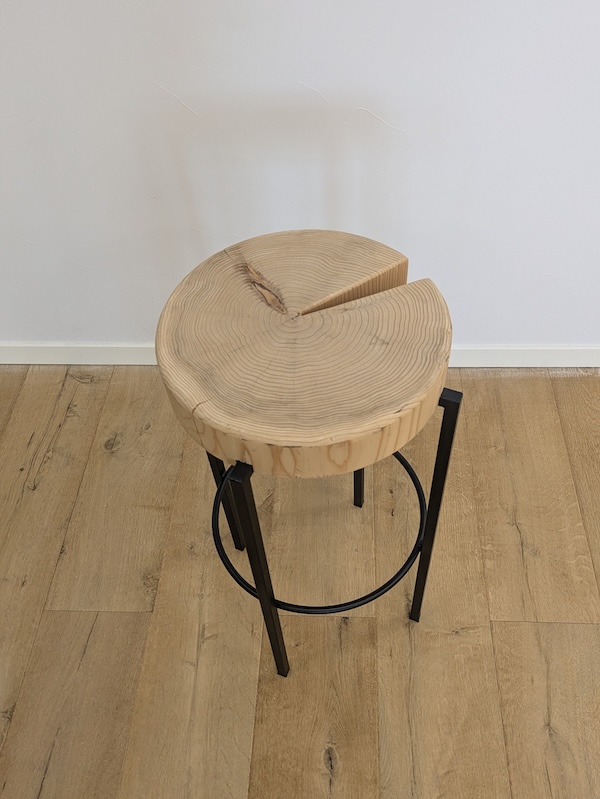 杉の丸太を輪切りにして椅子にしてみました。スチール製の脚で全体の剛性を持たせています。木は芯に近いほど狂いやすく水分が抜けてゆく過程で背割れしてしまいます。その背割れ防止のため座面に入れた切り込みが絶妙なチャームポイントとなっています。
